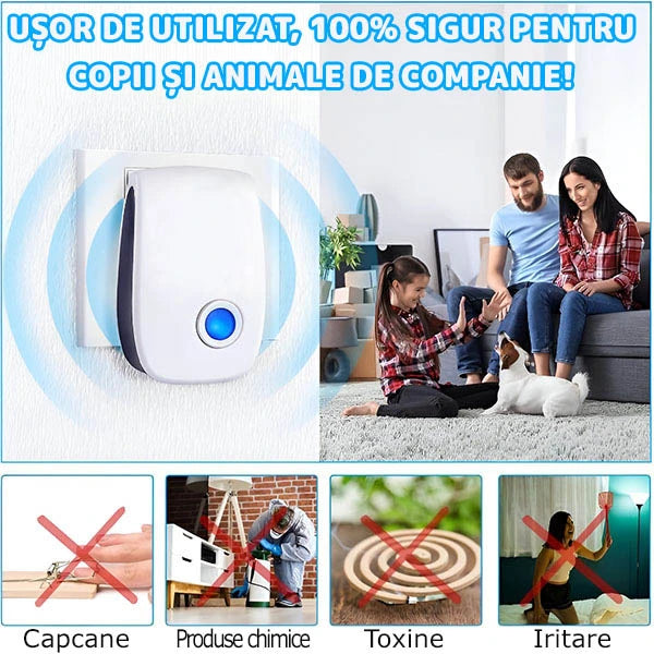 ⚡ Emite ultrasunete care alungă rapid rozătoarele și insectele, fără să deranjeze oamenii sau animalele de companie. Funcționează 24/7, doar îl bagi în priză.