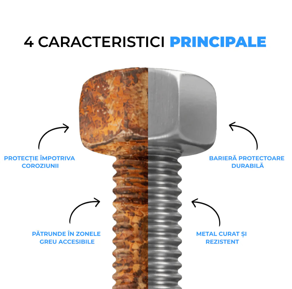 Pulverizezi, aștepți câteva minute și ștergi. Formula inovatoare dizolvă rugina fără frecare și fără să afecteze metalul.